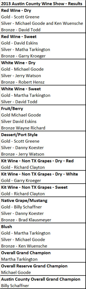 On Saturday, October 12, 2013, the Austin County Fair held their 2013 Non-commercial Wine Show and Judging at the Austin County Fairgrounds – Turnverein Building, in Bellville, Texas. The event was coordinated by the Austin County Grape Growers Committee.
