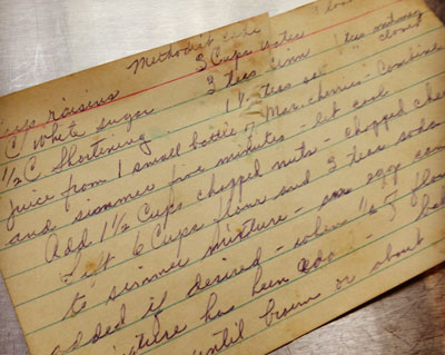 My mother lived on her own and in her own home up until about six months of her passing. Afterwards, we retrieved many of her most precious things: handmade quilts, picture albums, cookbooks, and a small box of handwritten recipes. After reading Alfonso’s blog, I located the small wooden box and thumbed through the index cards until I found it (mother’s Methodist cake recipe) complete with her greasy thumbprint at the top that made me stop for a moment to ponder this small testament of her being.