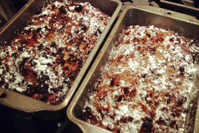 After searching my pantry and a trip to the market for some raisins, walnuts and shortening, I started the process. Part one was the cooking of raisins, cherries and nuts in the bright red juice of maraschino cherries laced with cinnamon, nutmeg, clove, sugar and shortening (organic – free of transfats, ergo healthier, I guess). Part two was combining this concoction with flour and baking soda to form the batter that was divided into two well oiled bread pans. Part three was baking for 45 minutes at 350 F while the familiar aroma permeated our house.