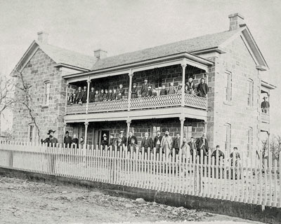 After establishing his vineyard and refurbishing the farm house, Carl and his wife Frances purchased the turn-of-the-century sandstone buildings in Pontotoc, including what had been the grocery store, hardware store, post office, barber shop, and movie theater, with the idea of making the town into the center of viticulture and enology in the Northern Hill Country. The five buildings form historic downtown Pontotoc and stand facing the ruin of San Fernando Academy.