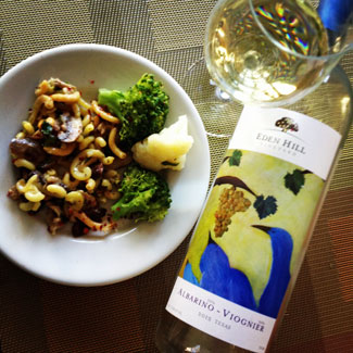Then, I set off to prepare just the right dish to complement the wine. I started by keying on something common to the Spanish roots of the Albarino and the Rhone Valley of France where Viognier originates: garlic. I whipped up a course of curly, vegetable pasta intermixed with garlic, mushrooms, clams and a squeeze of Meyer lemon, and topped with a shake of crushed Aleppo pepper and grated cheese.